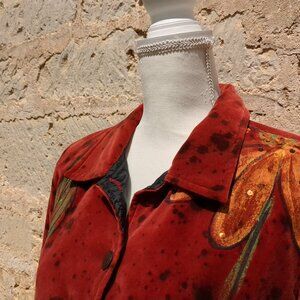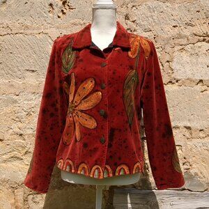 This lovely jacket by Alex Kim is perfect for autumn style. Featuring a button front and floral designs, this jacket is sure to be your go-to for get-togethers with friends or just shopping. Size S.