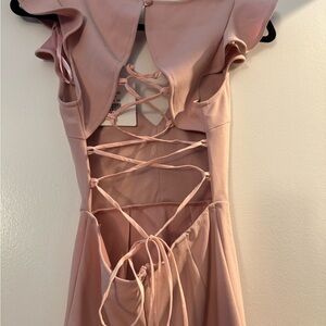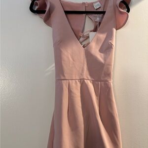 Chic mini dress with a deep V-neckline. Features flutter sleeves and a fitted waist. Perfect for a stylish outing.