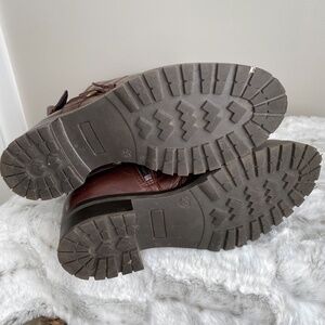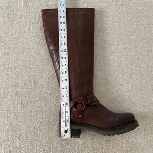 Knee high riding boots/harness boots in brown leather from Miz Mooz with a 1.75" heel and lug soles. Inside full zip, elasticized calf gussets and moto style buckle/harness detail. Soft, brushed interior lining. The most comfortable low heeled boots I have ever worn! Good for largish calf sizes although they are not technically wide calf.