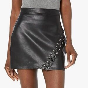 Black faux leather mini skirt. Features stylish lace-up diagonal detail. Tag size 32. See pics for exact measurements. Very good gently worn condition. A few small, slightly faded areas throughout due to wear (See last photo.)