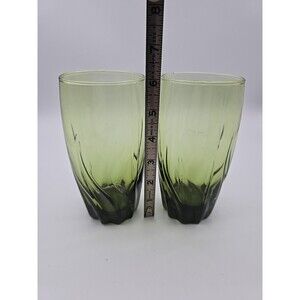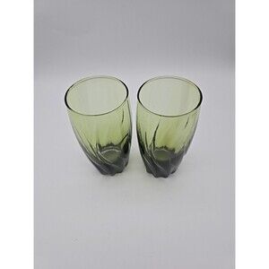The Vintage Anchor Hocking MCM Olive Green Starfire Swirl Central Park Set of 2 is a charming set of pressed glass tumblers from the 1970s. This two-piece set features a classic swirl pattern in a vibrant olive green color, perfect for all occasions.