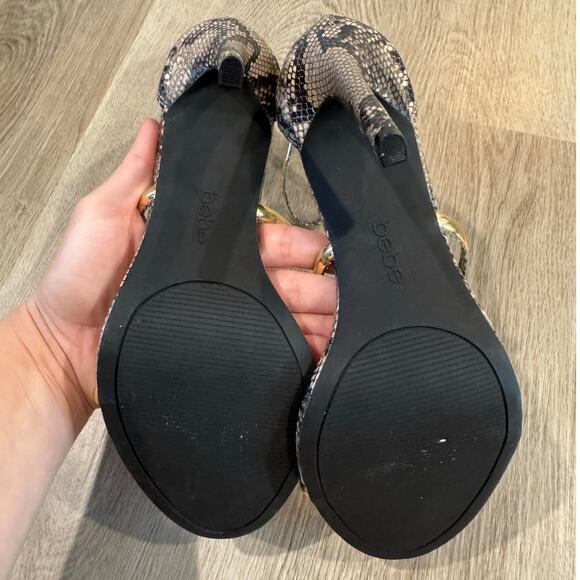 Bebe Berdine Ankle Strap Sandal Snake Skin and Gold Strappy Heels Size 8.5