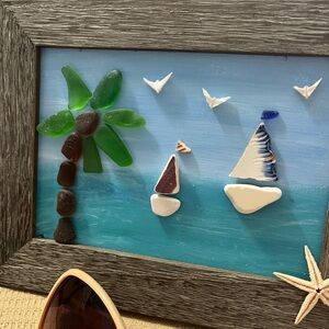 Fun Beach Bundle! 1. JavaSok with pink flamingos - original price 15.00. Adjustable woven sun visor with bow, excellent quality/never worn. Original price 20.00. Sunglasses original price 12.00/never worn. Lane picture wooden with saying “the ocean is where I belong” has small rust spot on hanger in back. See picture. Original price 25.00. Beach Glass picture excellent condition original price 45.00.