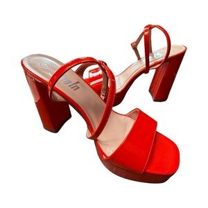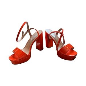 Please note there’s no shoebox and there is tiny minimal blemishes. Only worn once and have been sitting in my closet for five years. These are a size 9 strapped chunky platform heels.