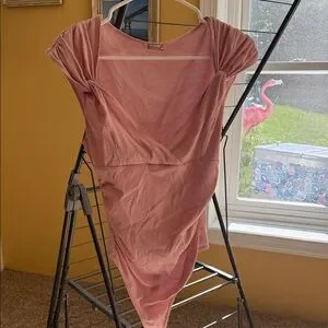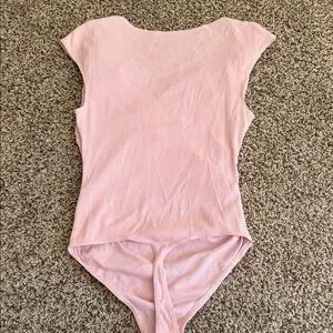 Chic pink bodysuit with wrap design. Soft and stylish. Ideal for layering.