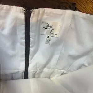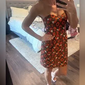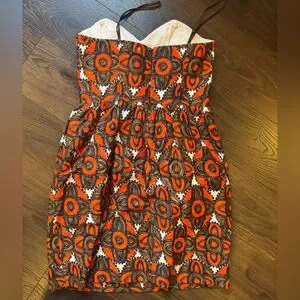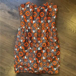 Eye-catching strapless dress by Milly. Features a striking orange and black pattern. Ideal for making a statement. Excellent condition, no defects. Bodice structure. No straps.