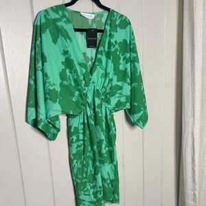 Chic green blouse with floral pattern. Flattering V-neck and flowing sleeves. Ideal for versatile styling.