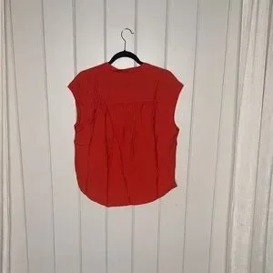 Chic red sleeveless blouse. Features button-up front and chest pockets. Ideal for work or casual wear.