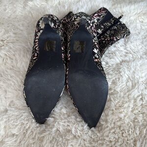 Pointed toe heeled ankle boots with a floral tapestry design, zip up closure.Size 8.