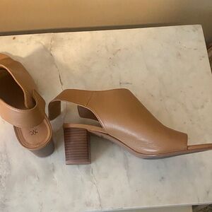 Elegant tan leather mules with open-toe design. Features a comfortable block heel.