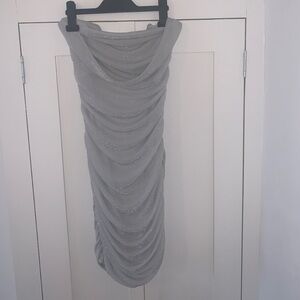 Elegant silver mini dress with halterneck style. Features ruched detailing for a sleek fit.