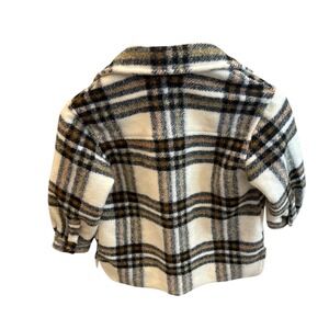 Adorable kids shacket in a cream, brown, and black plaid pattern. This stylish piece features a button-up front, making it easy to layer. The classic plaid design ensures it is versatile enough to match a variety of outfits. Two front pockets add functionality and a touch of charm. Perfect for keeping your child warm and fashionable on playdates, casual outings, or school events.