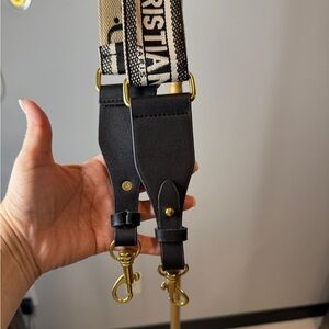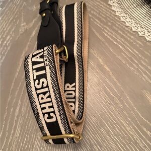 Stylish Christian Dior strap in black and tan. Features bold branding and gold hardware. Not an authentic piece.