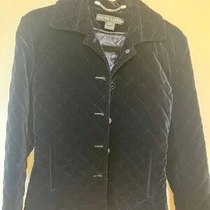 Gorgeous Midnight Blue Ralph Lauren Quilted Velvet Jacket size Small. The fabric is rich and soft. The pictures don't do it justice, as the light is strange. It really is a dark, dark navy blue. Slight flare, with a fitted waist. Beautiful fall piece, a classic. Jacket is medium weight and could be warn as a blazer or jacket. It has deep pockets too.