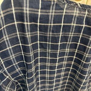 This top features a relaxed boxy fit with a stylish mandarin collar and 3/4 sleeves. The blue and white color scheme adds a classic touch, making it versatile for various occasions. Crafted by Leon Max in England this button-down shirt is a perfect blend of comfort and style.