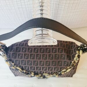 Beautiful authentic Fendi Mama Baguette in brown and black Zucchino pattern and gun metal hardware. Authenticated through authentic detective. Non branded acrylic tortoise pattern chain added to buckle, can be easily removed if you prefer. ✳️Call out: scratches to hardware, scratches to leather, usual for age. Canvas is clean without tears. Bag has been cleaned with retro-clean. Open to reasonable offers!