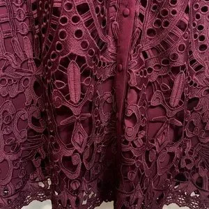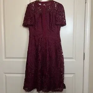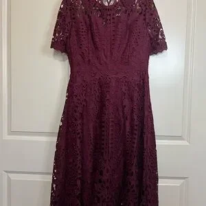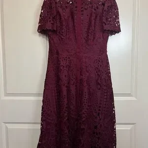 Chic lace midi dress in deep burgundy. Perfect for elegant events.