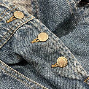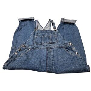 These denim overalls feature a hook closure on the bibs, branded hardware, and patch on the back. Good condition, some fraying on one hook closure (see photo) and denim fading. The hem has been shortened, folded and whipstitched (see photo). The stitching can be removed, original hem intact. Size 18