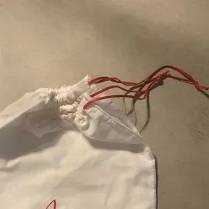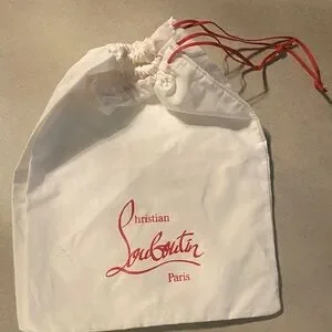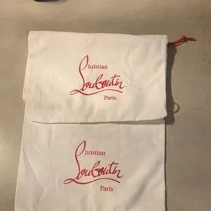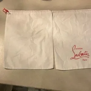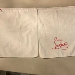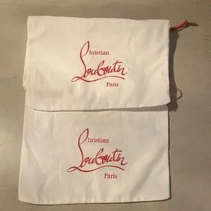 Two Elegant white soft canvas drawstring bags featuring iconic red Christian Louboutin logo. Perfect for storage.