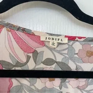 Elegant maxi dress with vibrant floral design. Features pink and brown hues. Perfect for any occasion.