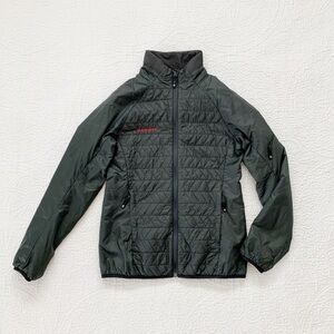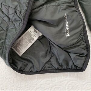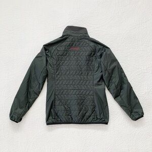 Sporty mid-weight wool-blend insulated jacket perfect for hiking year round. Preshaped sleeves and chin protections for feminine fit and comfort.