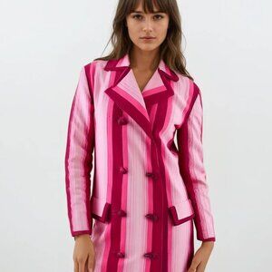 RARE Moschino Couture Pink Striped Sweater Coat. $2,600 retail. Oversized fit. 100% Virgin wool. Double-breasted. Button closure. Front flap pockets. Darted bust. Some stretch. Unlined. Medium-weight Made in Italy.