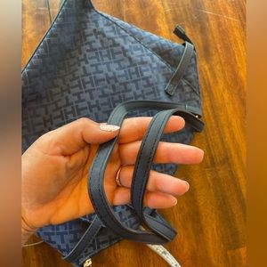 Tommy Hilfiger brand large purse with handles. Good size handles. Navy blue TH monogram style. Buckles for decoration. EUC. Worn and used for only a short time. Zips fully at the top and has zipper and pockets inside. (See other matching style purse for sale.)