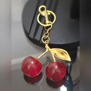 Stylish keychain with gold hardware and red cherry design. Perfect accessory for bags or keys.