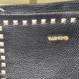 Stylish Valentino crossbody bag in black. Features gold stud accents. Perfect for modern elegance.