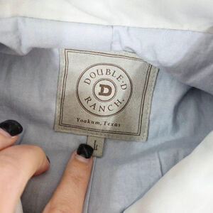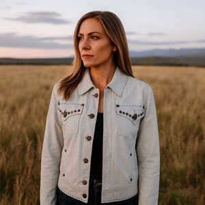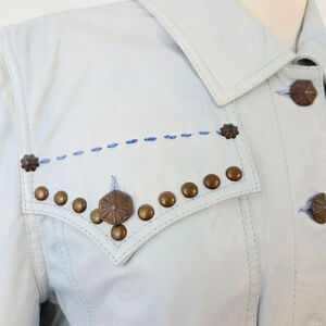 Double D Ranch light blue leather moto jacket. The softest leather brushed with a light powder blue finish. Studded all over with a mix of studs that have an antiqued look to them Side pockets. Chest pockets. Collared. Western style yoke. Blue embroidery stitching trim.