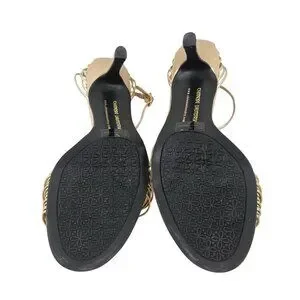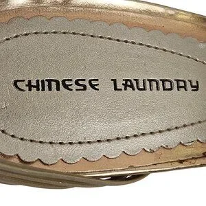 These Chinese Laundry sandals feature a striking gold design with a strappy upper and a stylish heel, offering an elegant touch to your outfit.