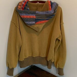 Easel Multi-Color Hooded Sweatshirt. Brown, Blue, Red, Peach and Pink. Thick jersey material with colorful sweater knit detail on chest and hood. Pullover, drop shoulder, ribbed cuffs and hem, kangaroo pocket, raw seams, relaxed fit, cotton/polyester blend. Gently used, excellent condition, no stains or tears, see pictures for details.