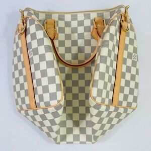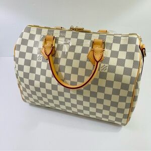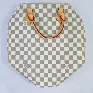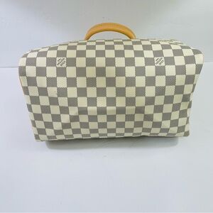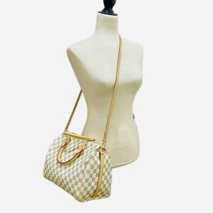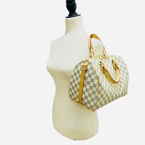 This bag resembles the Louis Vuitton Damier Azure Canvas Speedy Bandouliere 30 Bag. There is a removable protective film over the canvas on the handle area. Beautiful like new quality. The crossbody strap is not included but you can purchase on Amazon. Elevate your style with this elegant checkered crossbody bag in cream and tan. Perfect for any occasion, this bag combines fashion and functionality.