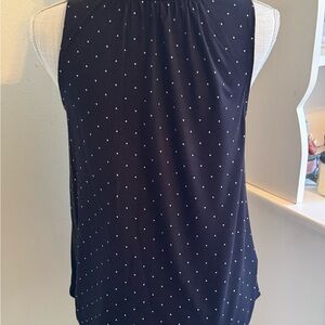 Loft black sleeveless mixed media top with small white polka dots, size SP. 100% polyester front, 100% rayon back. Machine wash cold, cool iron.