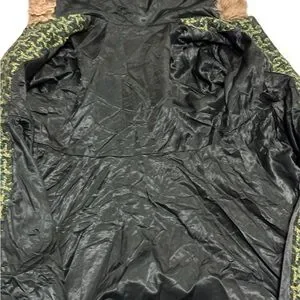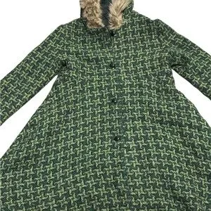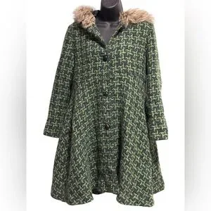 Stylish green patterned coat with button closure. Perfect for a chic look. Vintage. Possibly handmade. No size or maker tags. Feels like a wool acrylic blend. Lined with a heavy satin nylon material. Good with faux fur.