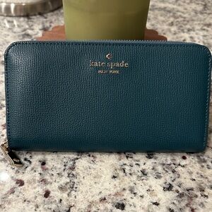 Chic teal leather large wallet by Kate Spade. 7-1/2 x 4 x 1”Features a zip-around closure. 12 credit card slots, (1) zippered compartment and (2) open compartments. Has (1) outside open pocket and silver tone hardware. Lightly used excellent condition.
