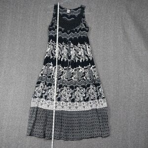 BILA WOMENS BLACK WHITE DRAWSTRING CROCHET NECKLINE MAXI DRESS SIZE LARGE. 100% RAYON. BLACK AND WHITE FLORAL BOHO PRINT. DRAWSTRING EMPIRE WAIST. CROCHET NECKLINE. NO LINING. MEASUREMENTS PROVIDED.