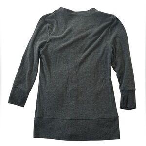 Chic charcoal cardigan with button-up front. Ideal for layering. Soft and comfortable. 3/4 length sleeves and tunic length.