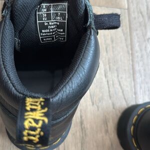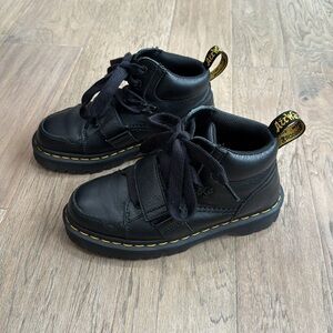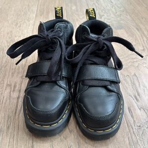 Black leather boots with lace-up and strap. Iconic yellow stitching. Rugged sole for durability.