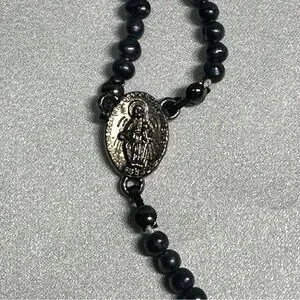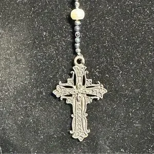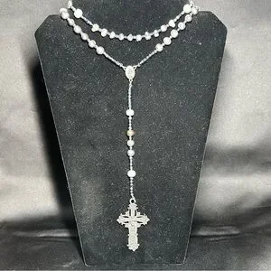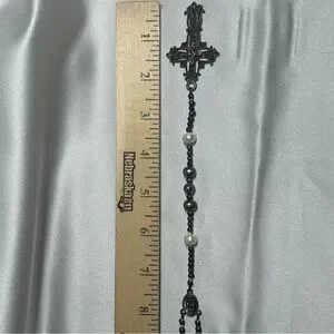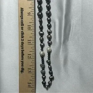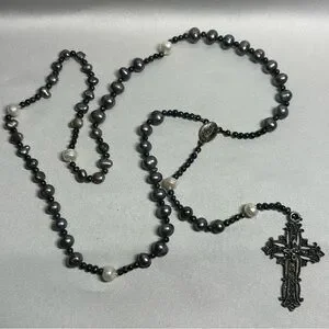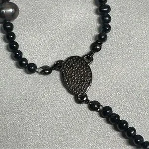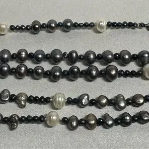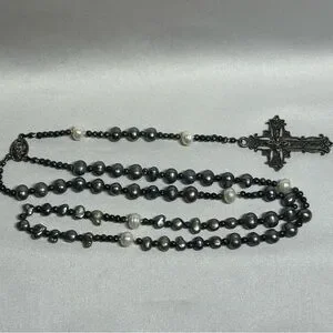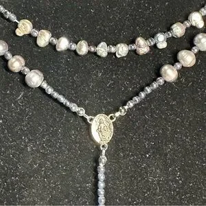 reGreen Creations handmade genuine pearl rosary necklace. These necklaces are made using upcycled materials, Tahitian colored grey pearls, white pearls, and small blue pearls as spacers. Strung on 100% silk cord. Each piece is one of a kind!
