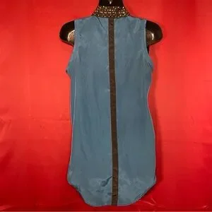 Teal blue Rock & Republic blouse with a studded collar for that edgy touch. Sleeveless design featuring an adorable stud button at the neck. Black contrast detail and a hidden button placket down the front. Light, silky material.