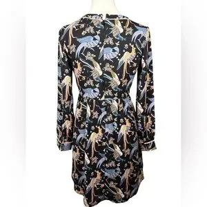 Chic and playful, this Ann Taylor Loft mini dress features a striking bird print in pastel tones against a black background. Designed with long sleeves, light pink piping trim, and a flattering cinched waist, it’s perfect for both casual outings and dressier occasions.