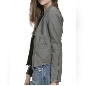 Great condition. Size 0. Grey in color. Motto style. Zipper and top button closure. Faux leather. Zipper details on arm cuffs. Measurements and fabric content listed above in pictures.