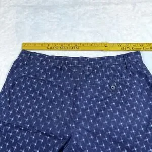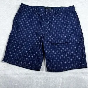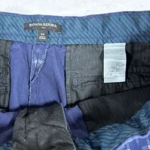 These Banana Republic Men's Shorts in size 34 are a stylish and versatile addition to any wardrobe. The blue plaid cross pattern adds a touch of preppy flair, while the chino style gives them a classic and polished look. Made from cotton knit fabric with a mid rise and 11 inch inseam, these shorts are perfect for a variety of occasions including travel, casual outings, workwear, and business settings. Featuring a zip closure, button and zipper accents, slash pockets, and easy care instructions, these shorts are both practical and stylish. Perfect for summer, fall, and spring seasons, these shorts are a must-have for the modern man.