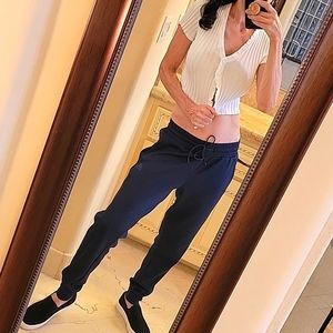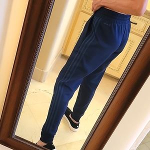 ADIDAS Navy Blue Joggers, S. Oh-so comfortable with a drawstring waist and some stretch. Double Track stripes on each side. Ribbed ankle cuffs. Excellent pre-owned condition.