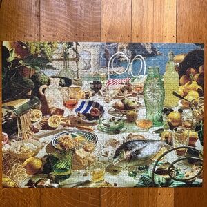 Piecework Puzzle La Dolce Vita 1000 Piece Puzzle. Thick stock and high-quality recycled art paper. Good used condition. No missing pieces. Box sturdy, but has a few flaws (spots where tape pulled off printing).