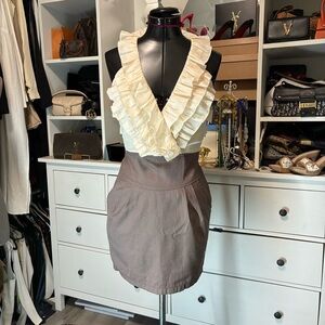 This dress features a cream ruffled top and a sleek brown skirt. Perfect for all occasions.