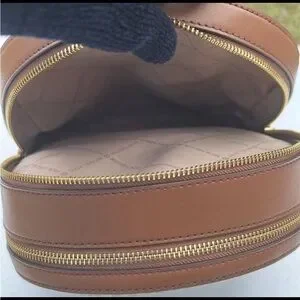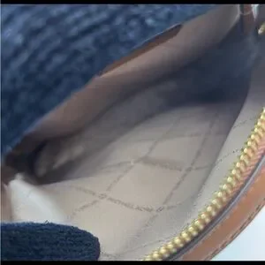 Logo-print canvas. Gold-tone hardware. 8.75”W X 12”H X 4.25”D.