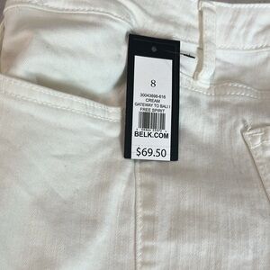 Crown & Ivy Embellished Capri, off white, legs are cut out and have floral embroidery, size 8 with waist measuring 15.5” flat across, new with tags.
