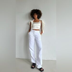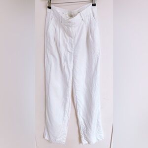 The Wilfred icon that goes with everything, every time. These are tailored-yet-relaxed high-rise pants with front knife pleats, easy drape and a long, wide leg. These ones are cut from soft, drapey fabric made with linen and TENCEL™ Lyocell — responsibly sourced wood-based fibres produced through a closed-loop system that reduces environmental impact.